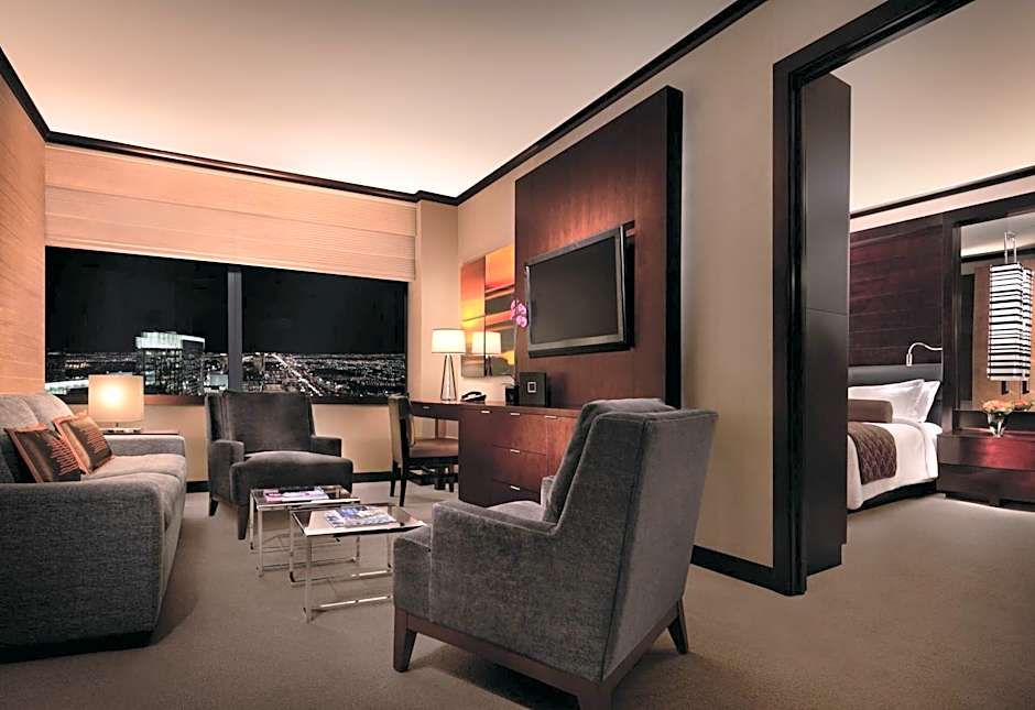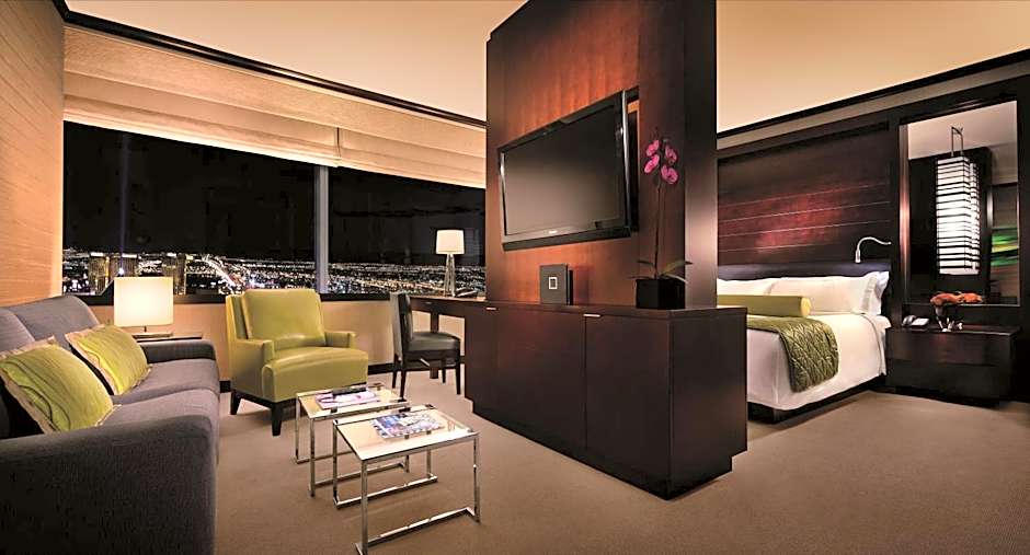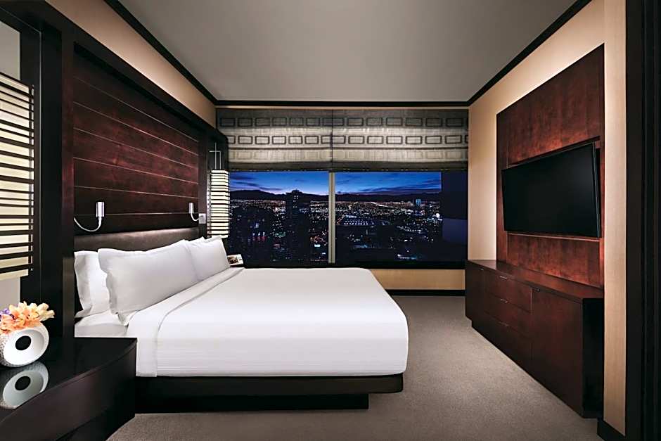 Featuring expansive views of the city center, this spacious suite features a spa-style soaking tub. Guests can prepare meals in the kitchenette.
